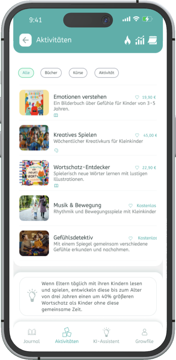 Ob Bücher, Kurse oder Aktivitäten – grow.parents empfiehlt dir genau die Angebote, die perfekt zu deinem Kind und seinem Entwicklungsstand passen. Kein langes Suchen mehr, sondern mehr Zeit für das Wesentliche.